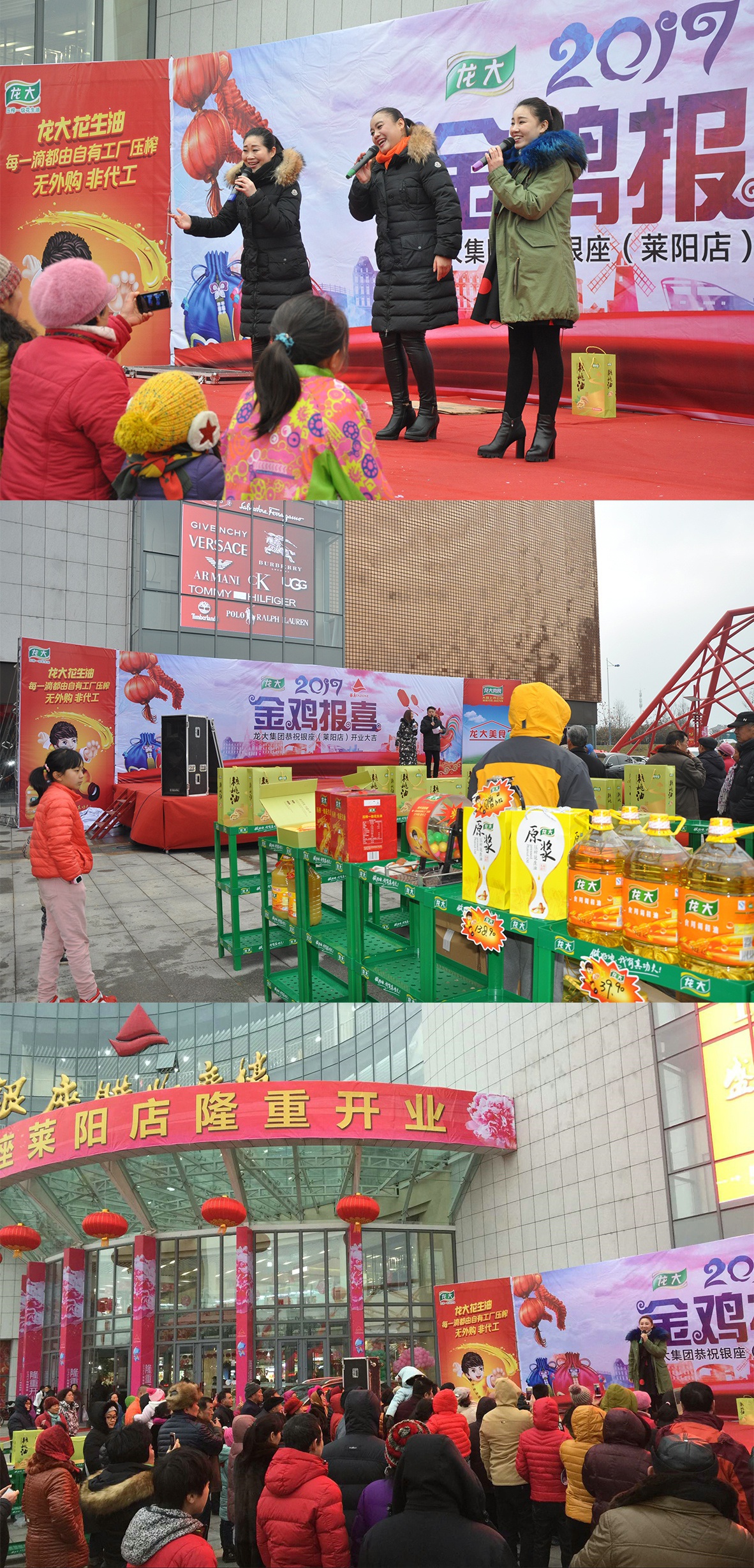 1月7日—9日,銀座萊陽店門前廣場喜氣洋洋。龍大集團組織旗下植物油、肉食品兩大內(nèi)貿(mào)產(chǎn)品進行為期3天的路演,為銀座萊陽店開業(yè)助力。