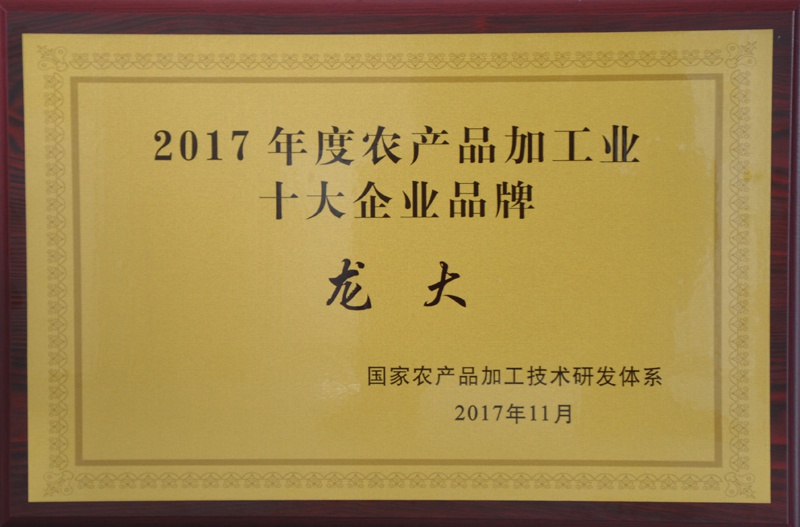 日前,在2017年全國農產品加工科技創新推廣活動現場,龍大集團獲評“2017年度農產品加工業十大品牌企業”。